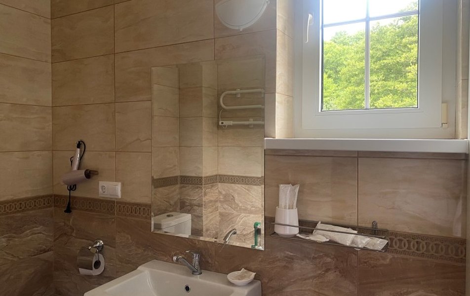Стандартный 2-местный Количество комнат: 1-комнатный Тип номера: Стандартный Вид из номера: на лес Кол-во основных мест: 2 Площадь (кв. м): 40 Этаж: 1,2 Мебель: зеркало, кресло, кровати односпальные /одна двуспальная кровать, прикроватные тумбочки, стол, стул, шкаф Оборудование: мини-холодильник, музыкальный центр, телевизор ЖК, чайный набор посуды, электрочайник Санузел: с ванной/душем, тапочки, туалетные принадлежности, фен, халат Сервис: Wi-Fi бесплатно, смена полотенец, смена постельного белья, уборка номера