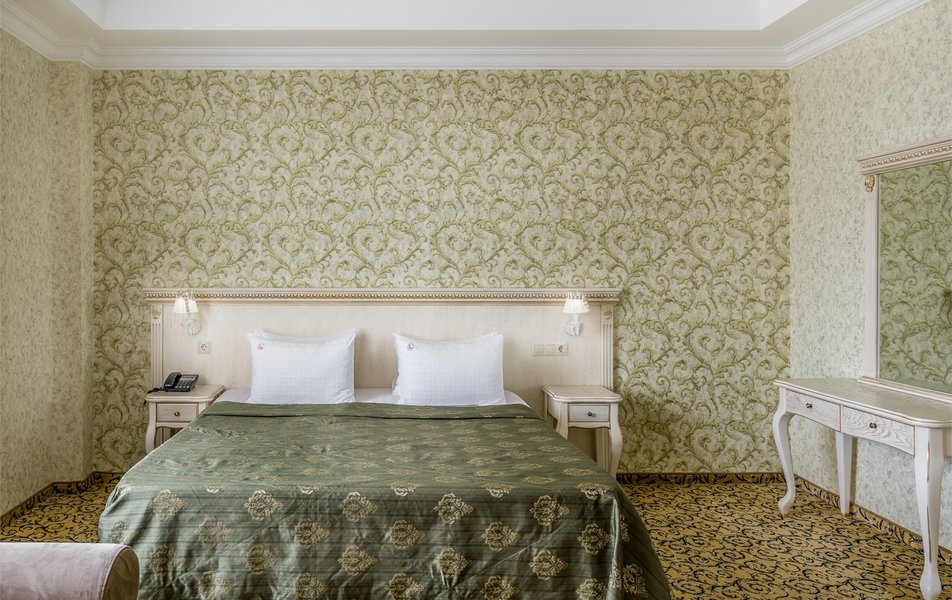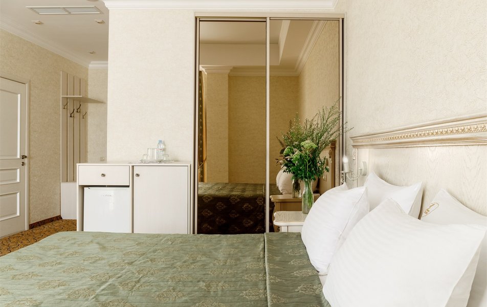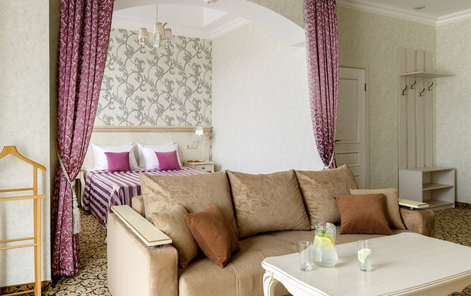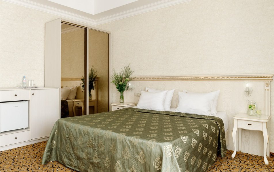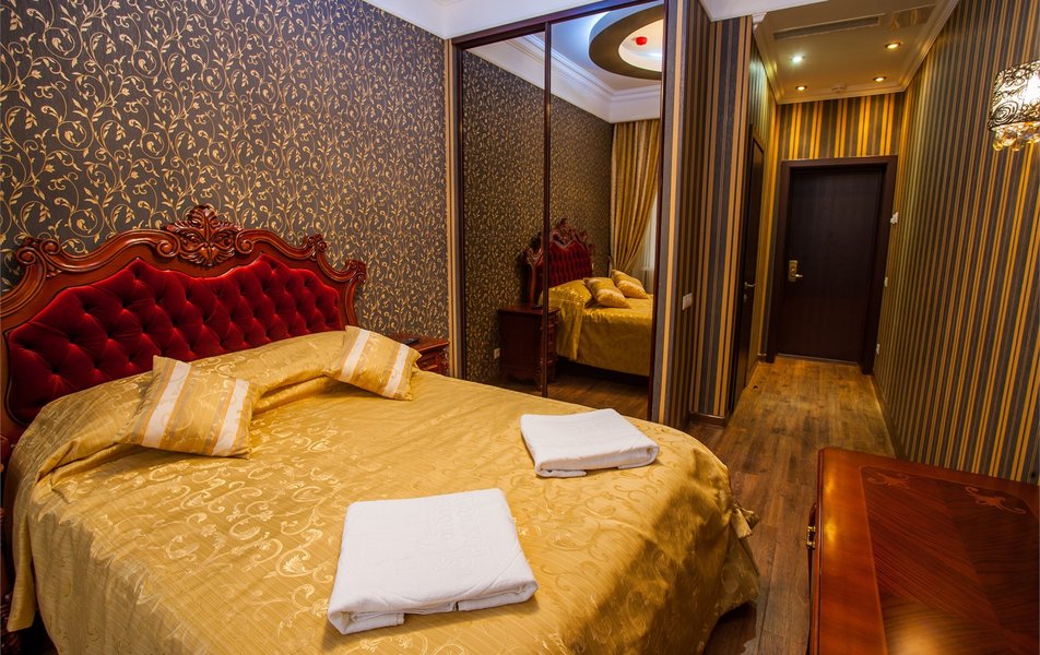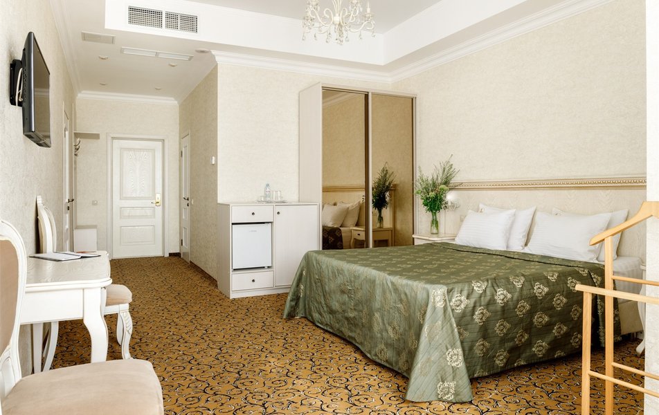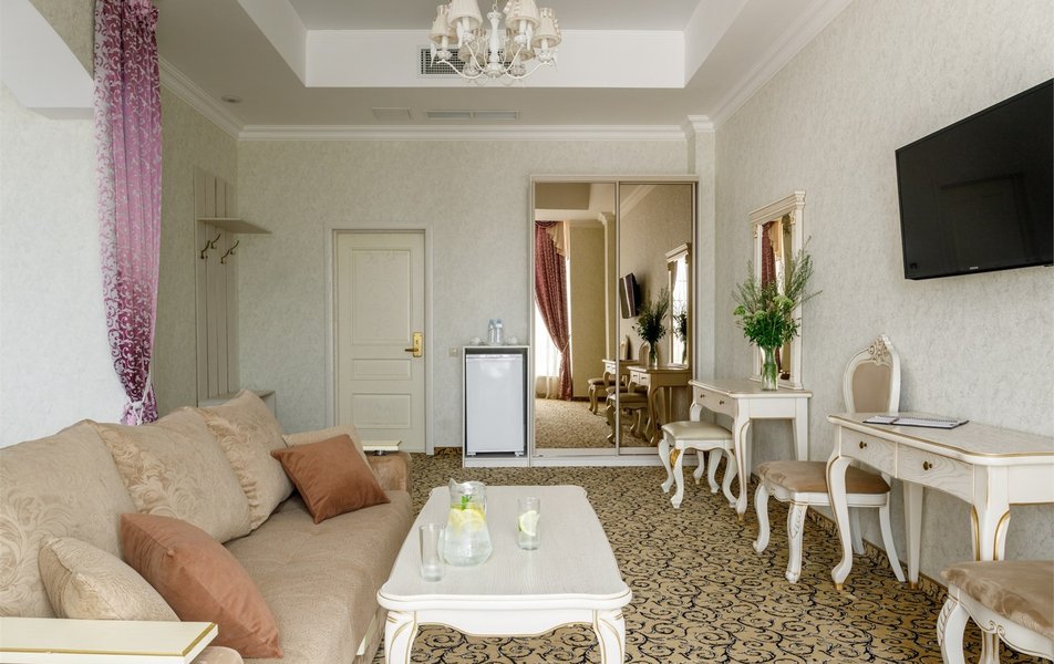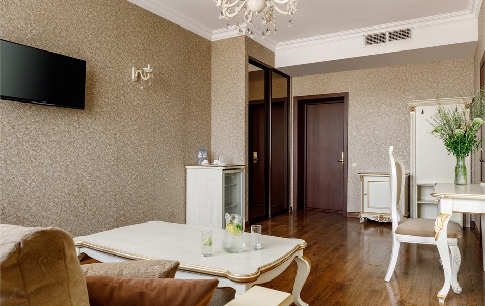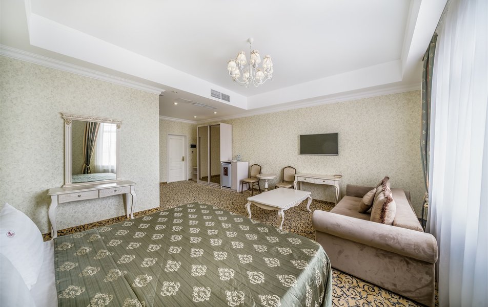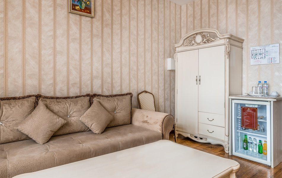 Люкс 2-местный 2-комнатный Количество комнат: 2-комнатный Тип номера: Люкс Дополнительное место: диван Кол-во доп. мест: 1 Кол-во основных мест: 2 Площадь (кв. м): 41 Мебель: вешалка, зеркало, кресло, кровать двуспальная, набор мягкой мебели, прикроватные тумбочки, стол, столик журнальный, стулья, тумба, шкаф-купе Оборудование: кондиционер: система климат-контроля, мини-холодильник, сейф, телевизор Санузел: биде, с ванной, тапочки, туалетные принадлежности, фен, халат Сервис: Wi-Fi бесплатно, смена полотенец, смена постельного белья, уборка номера