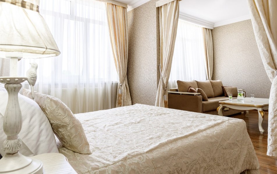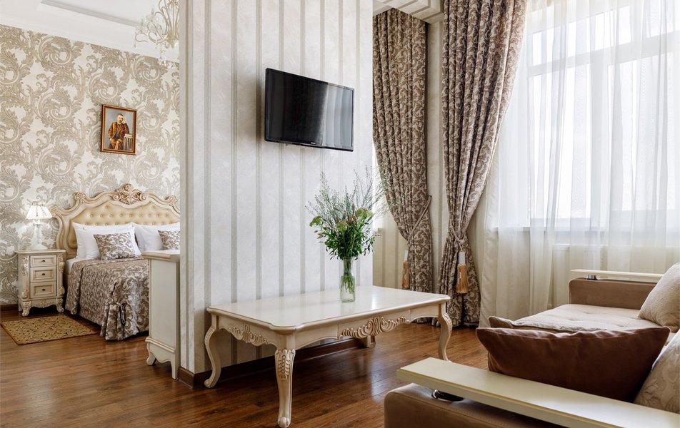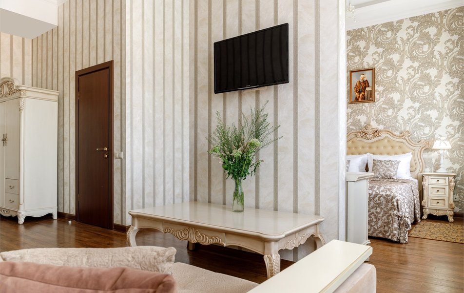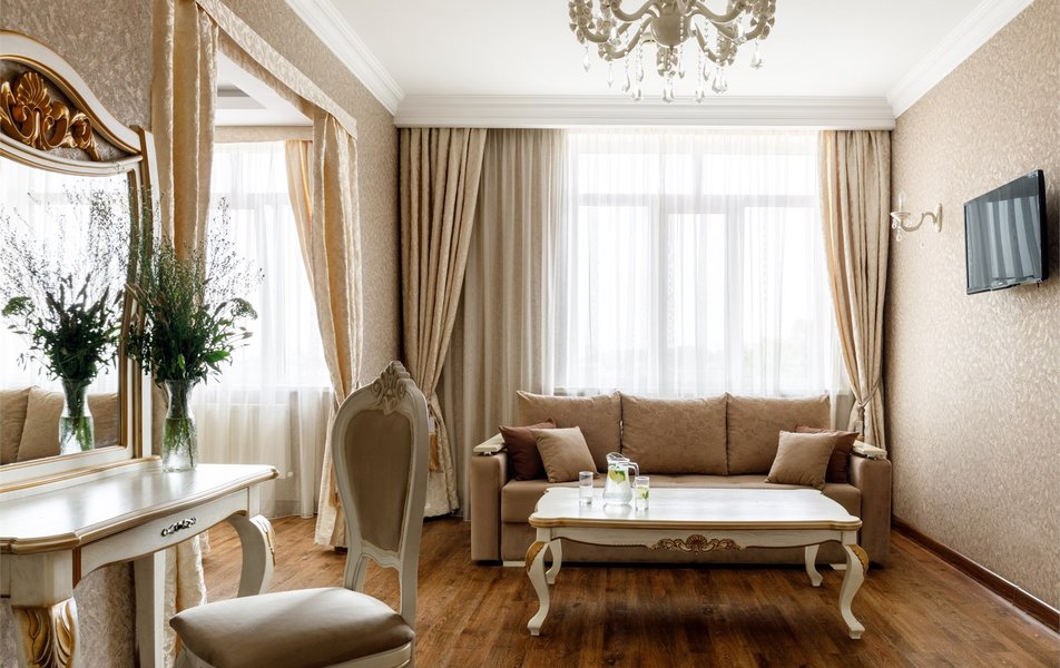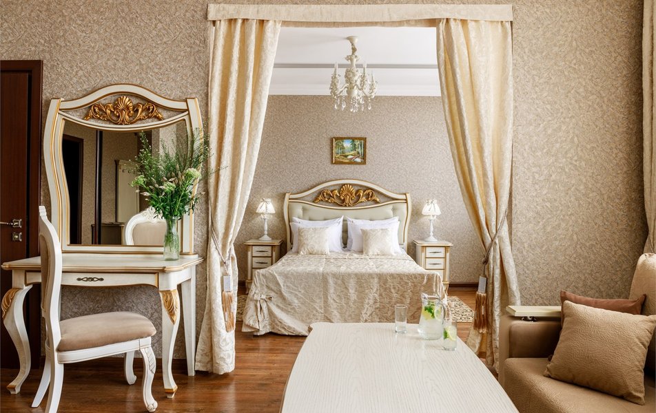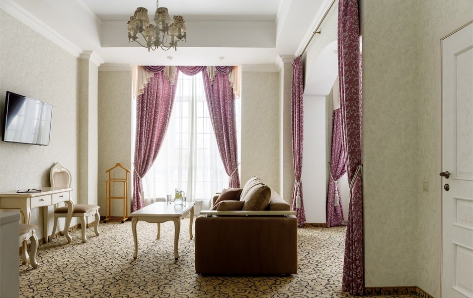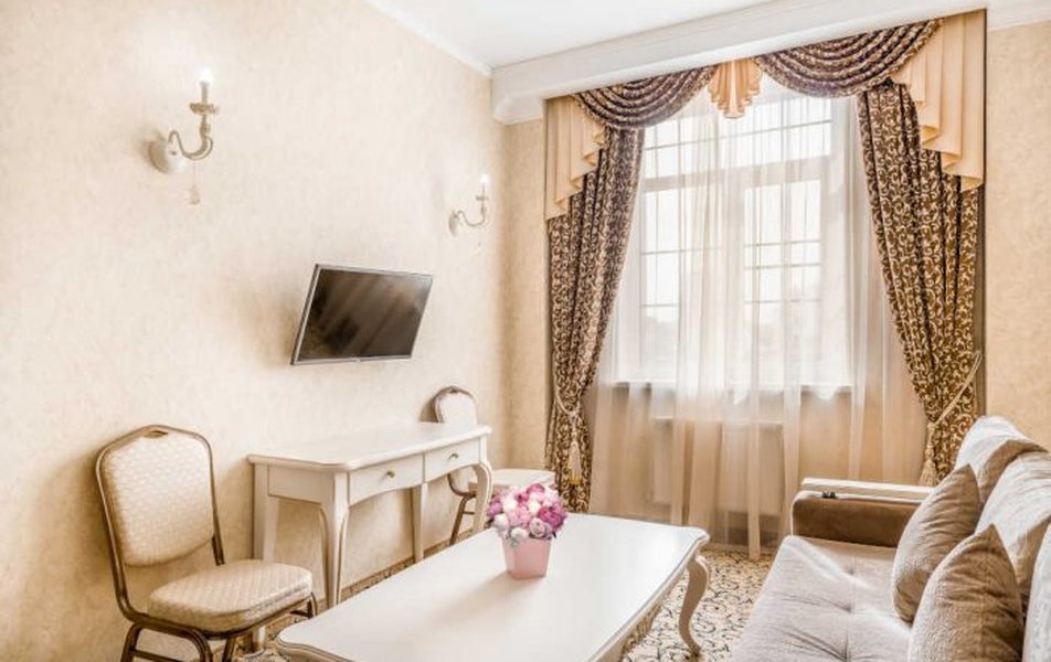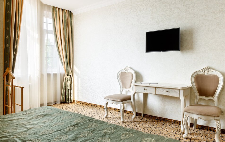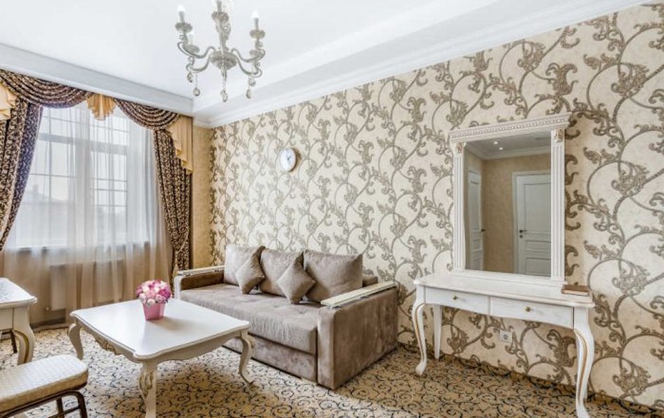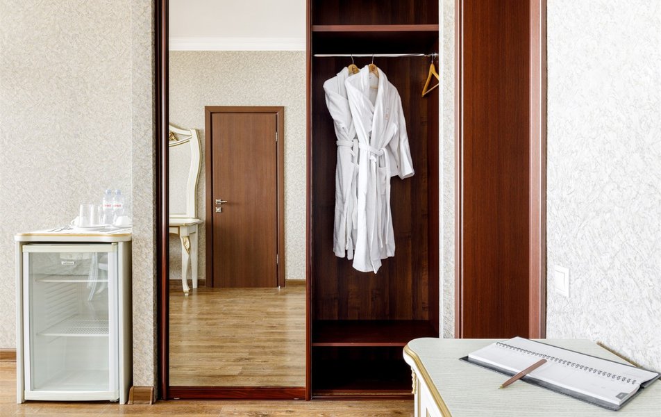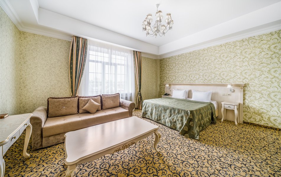 Люкс 2-местный 2-комнатный Количество комнат: 2-комнатный Тип номера: Люкс Дополнительное место: диван Кол-во доп. мест: 1 Кол-во основных мест: 2 Площадь (кв. м): 41 Мебель: вешалка, зеркало, кресло, кровать двуспальная, набор мягкой мебели, прикроватные тумбочки, стол, столик журнальный, стулья, тумба, шкаф-купе Оборудование: кондиционер: система климат-контроля, мини-холодильник, сейф, телевизор Санузел: биде, с ванной, тапочки, туалетные принадлежности, фен, халат Сервис: Wi-Fi бесплатно, смена полотенец, смена постельного белья, уборка номера