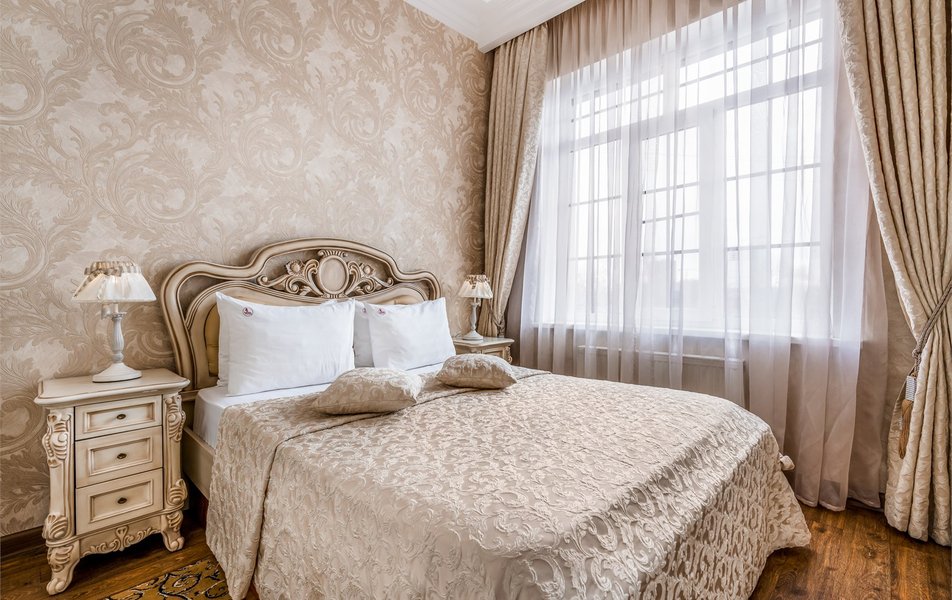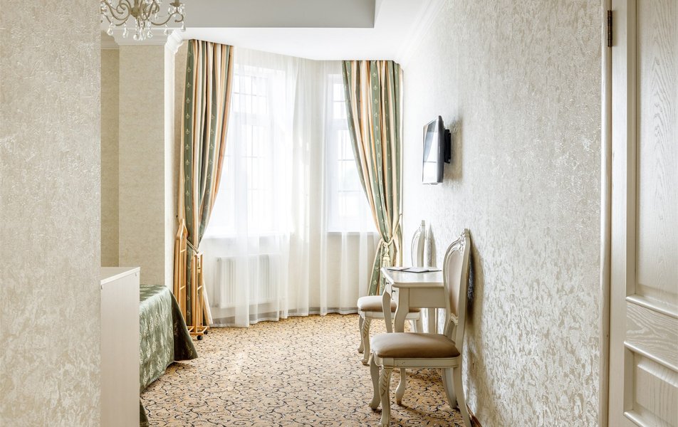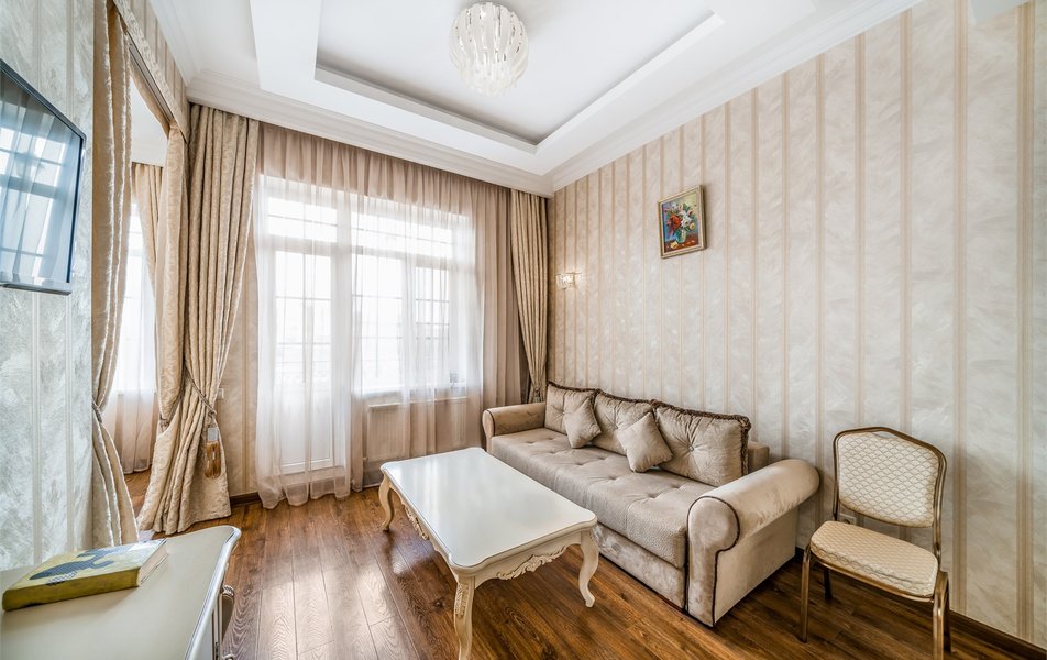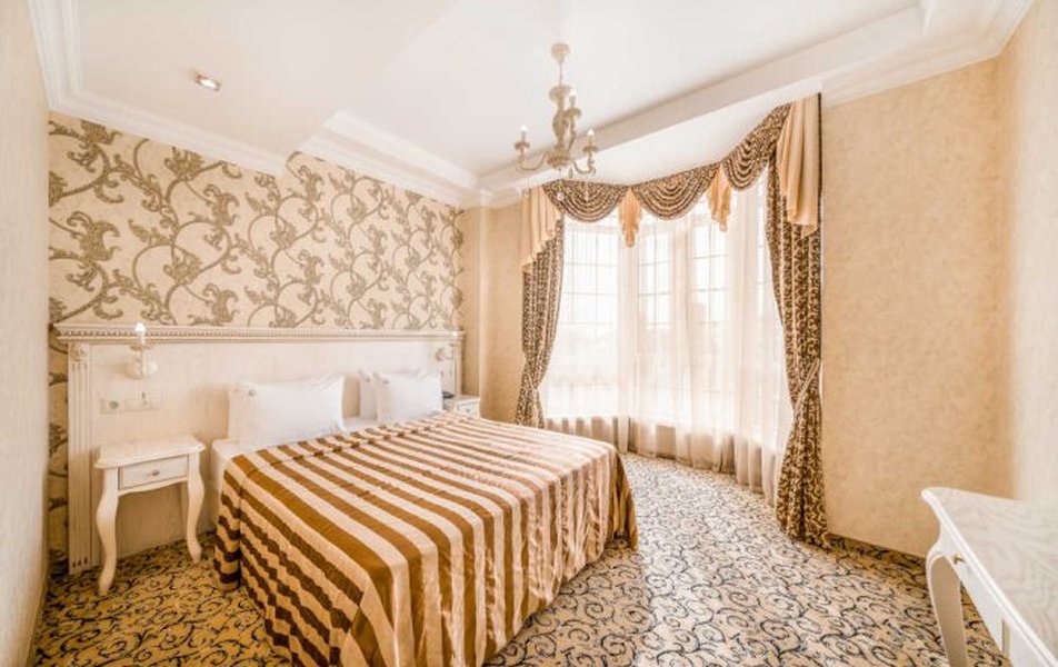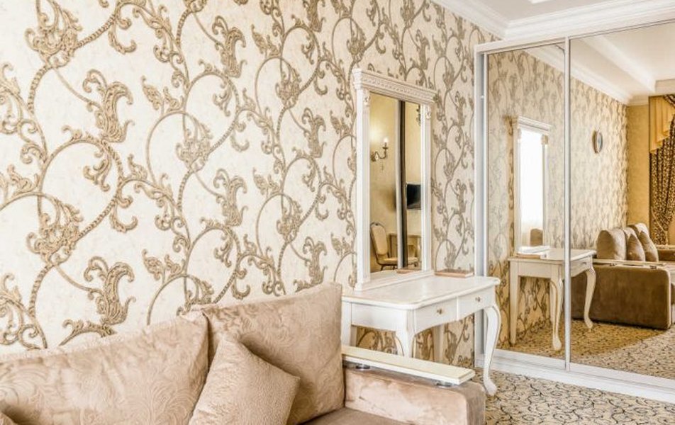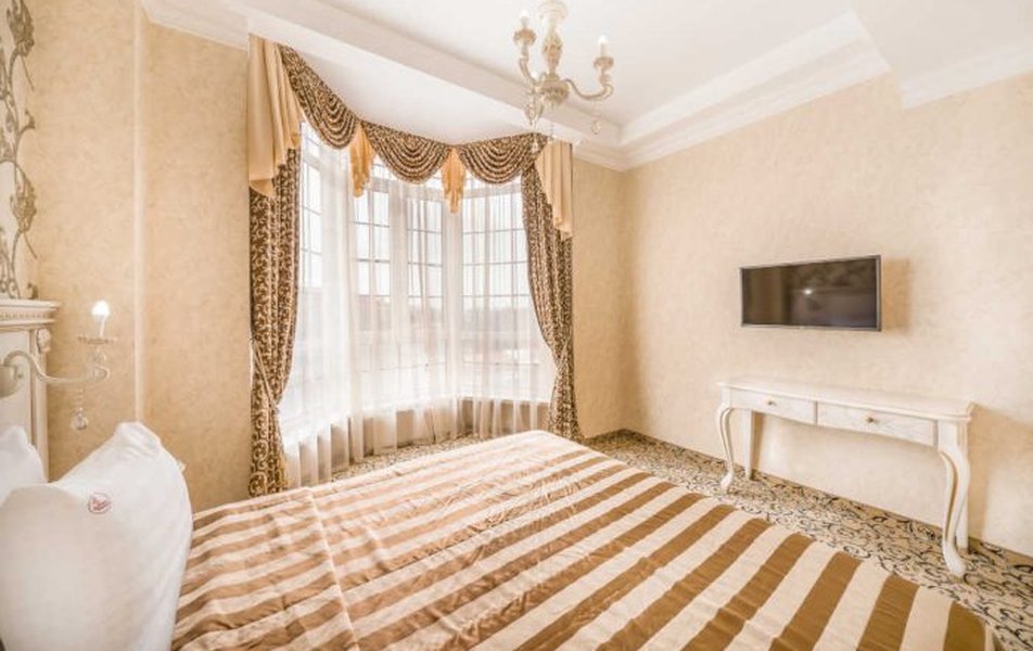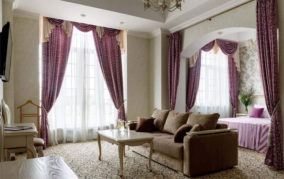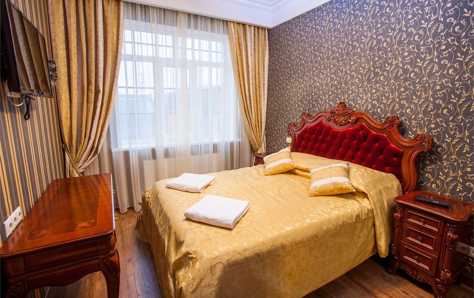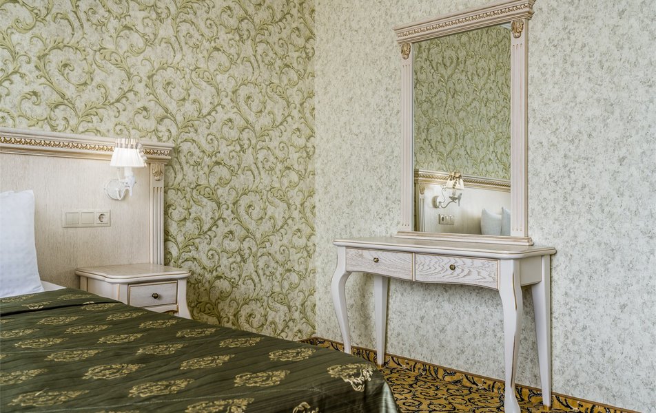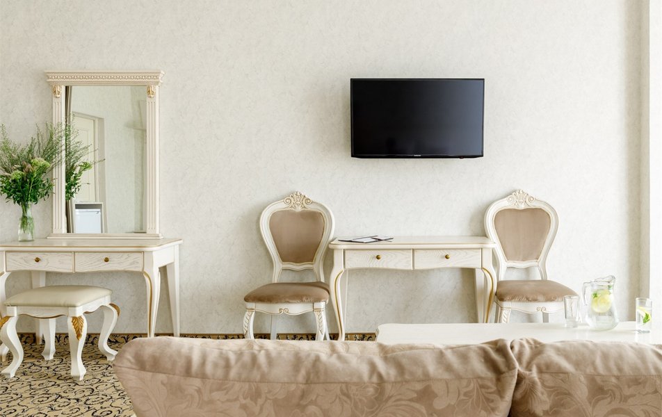 Люкс 2-местный 2-комнатный Количество комнат: 2-комнатный Тип номера: Люкс Дополнительное место: диван Кол-во доп. мест: 1 Кол-во основных мест: 2 Площадь (кв. м): 41 Мебель: вешалка, зеркало, кресло, кровать двуспальная, набор мягкой мебели, прикроватные тумбочки, стол, столик журнальный, стулья, тумба, шкаф-купе Оборудование: кондиционер: система климат-контроля, мини-холодильник, сейф, телевизор Санузел: биде, с ванной, тапочки, туалетные принадлежности, фен, халат Сервис: Wi-Fi бесплатно, смена полотенец, смена постельного белья, уборка номера