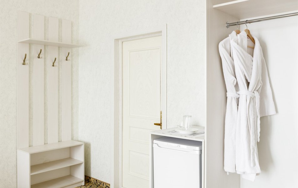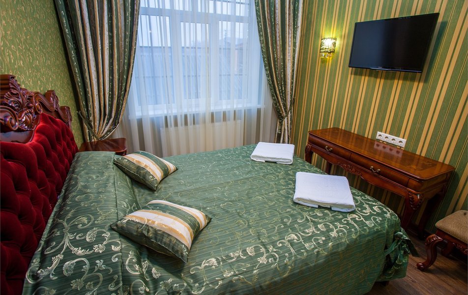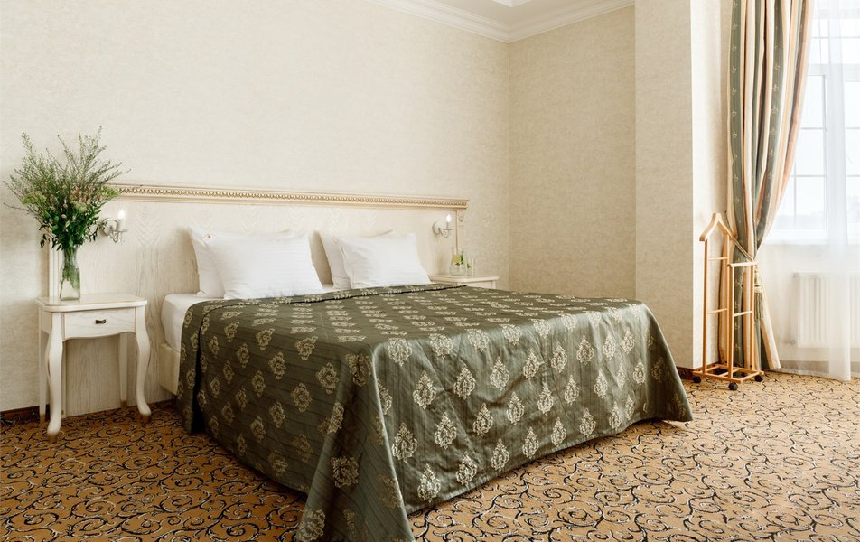 Бизнес 2-местный 1-комнатный Количество комнат: 1-комнатный Тип номера: Бизнес Дополнительное место: еврораскладушка Кол-во доп. мест: 1 Кол-во основных мест: 2 Площадь (кв. м): 25 Мебель: вешалка, зеркало, кровать двуспальная, прикроватные тумбочки, стол, стул, шкаф-купе Оборудование: мини-холодильник, сейф, телевизор Санузел: с ванной, тапочки, туалетные принадлежности, фен, халат Сервис: Wi-Fi бесплатно, смена полотенец, смена постельного белья, уборка номера