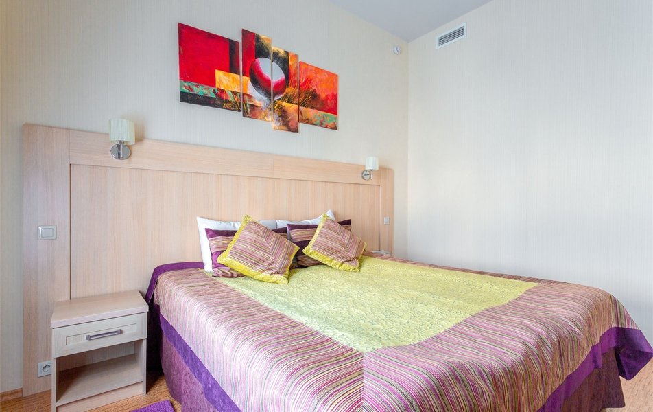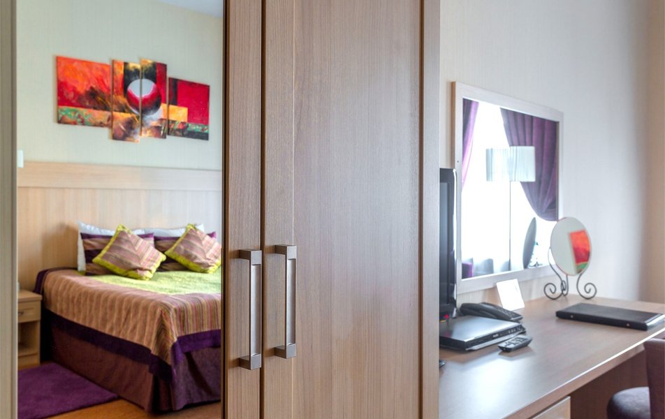 Делюкс 2-местный Количество комнат: 1-комнатный Тип номера: Делюкс Дополнительное место: кресло-кровать Вид из номера: на город Кол-во доп. мест: 1 Кол-во основных мест: 2 Площадь (кв. м): 25 Мебель: вешалка, зеркало, кровать двуспальная, прикроватные тумбочки, стол, стулья, шкаф Оборудование: кондиционер, мини-холодильник, сейф, телевизор, телефон, чайный набор посуды, электрочайник Санузел: с ванной, тапочки, туалетные принадлежности, фен, халат Сервис: Wi-Fi бесплатно, карточная система замков, смена полотенец, смена постельного белья, уборка номера, услуги внутренней телефонной связи